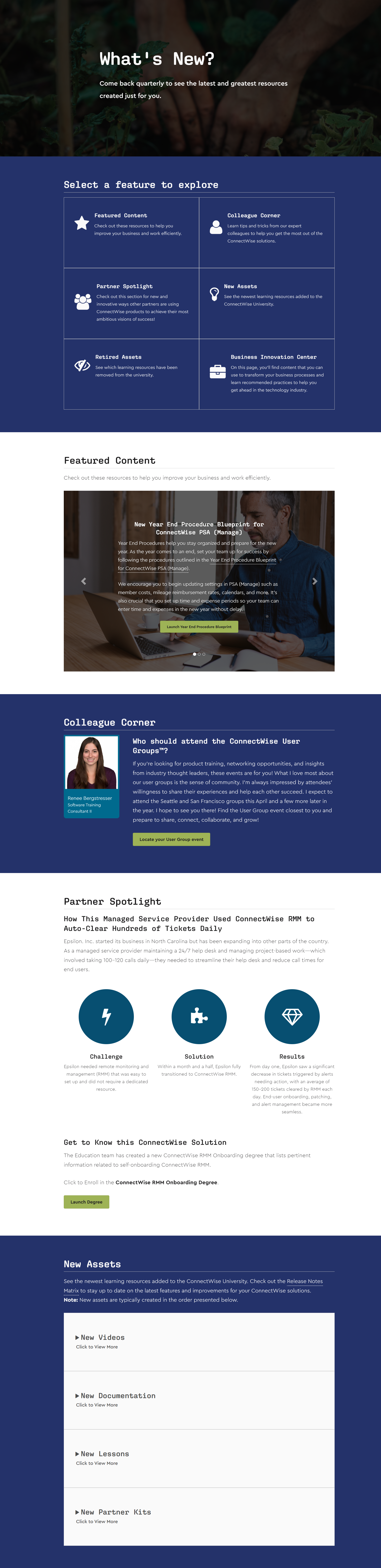 Project Introduction: In response to customer feedback requesting a simpler way to access the latest product resources, I collaborated with a web designer to develop a dedicated landing page for recent ConnectWise updates. I wrote the copy to highlight key product news, increase awareness of offerings, and drive engagement with products and services—creating a central hub that keeps customers informed and connected.